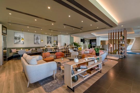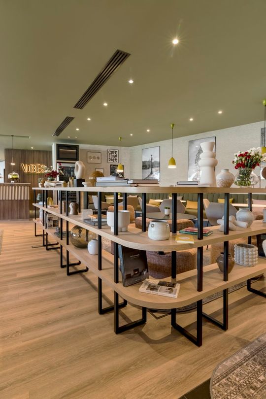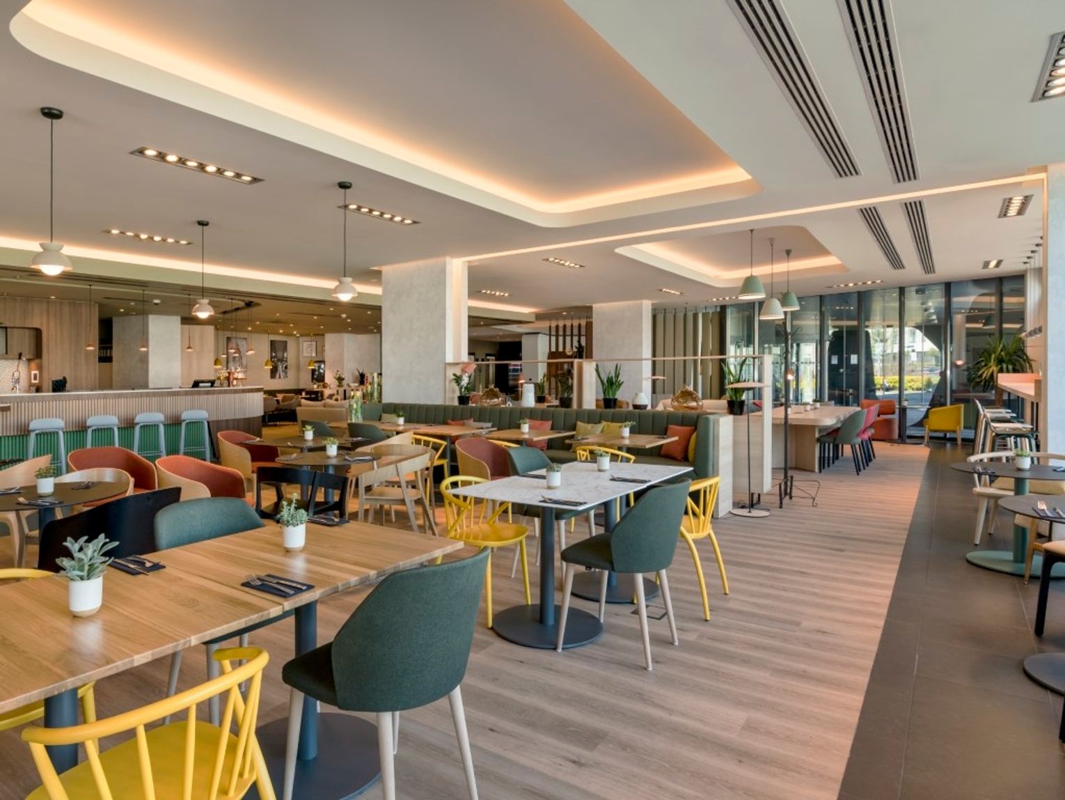 Głownym akcentem baru, któremu nadano nazwę Vibes jest drewniany kontuar, wykonany z ciemnego drewna z lamelami. Goście mogą korzystać w wielu stref, które wypełniają obszerne, głębokie sofy i fotele, wykonane z przytulnych tkanin, zapewniających komfort i relaks po dniu wypełnionym spotkaniami lub zwiedzaniem miasta. Dla gości, przygotowano także standardowe i podwyższone stoliki barowe położone w obszernych hotelowych witrynach oraz zapewniające intymność strefy w głębi baru. Restaurację wypełniają stoły wykonane z klasycznych materiałów jak kamienne kompozyty i drewno, a energii nadają różnorodne barwy i style mebli, wśród których są fotele obite tkaninami oraz energiczne, żółte i zielone krzesła. Architekci zapewnili także możliwość wydzielania poszczególnych stref w barze i restauracji poprzez tkaniny zawieszone na suficie oraz poprowadzone od podłogi do sufitu drewniane konstrukcje z jasnego drewna.