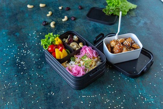 Wszystkie składniki bento poukładaj w oddzielnych przegródkach i ciesz się kolorowym oraz