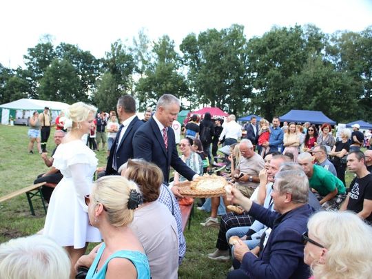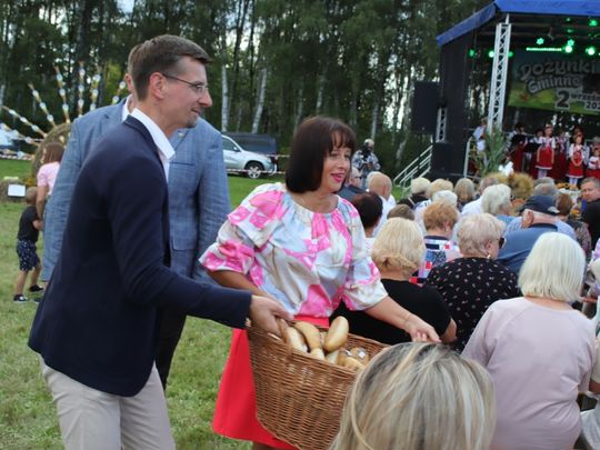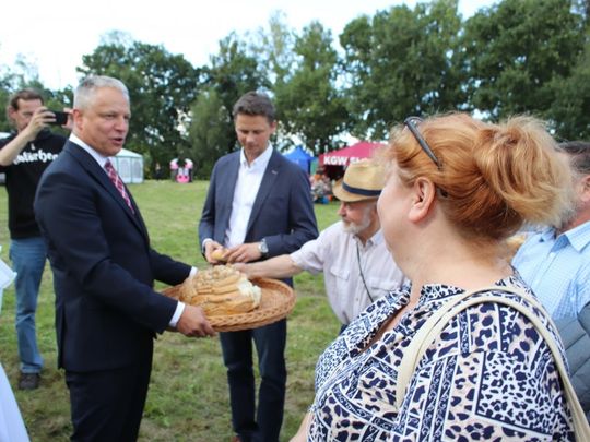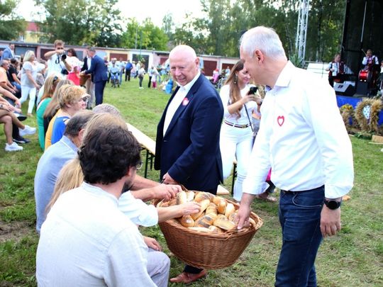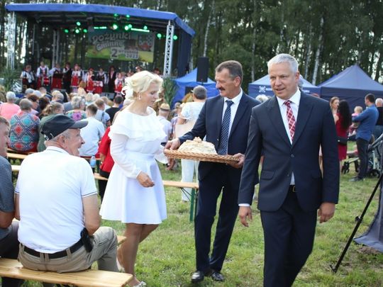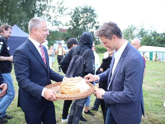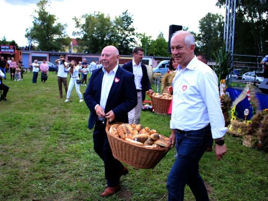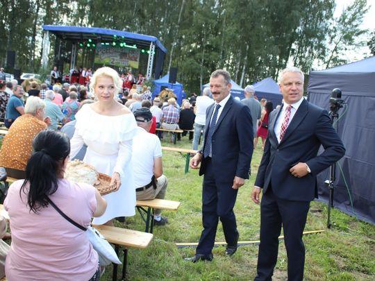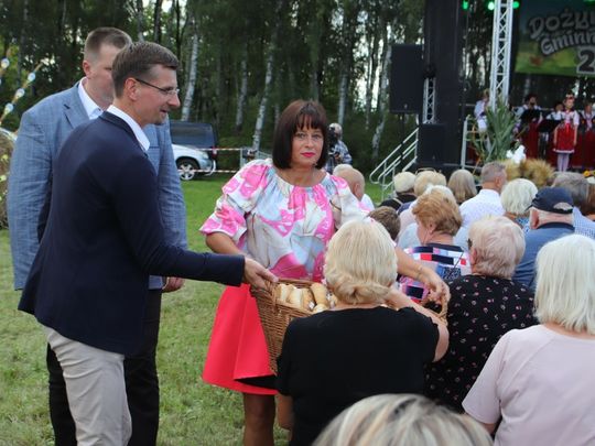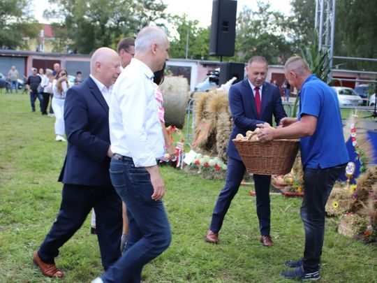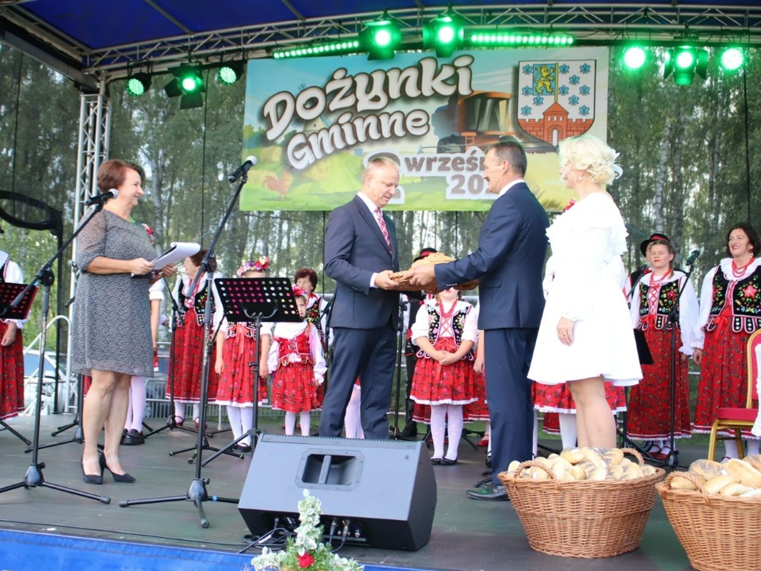 Witając przybyłych, w gorących słowach podziękował rolnikom za ich trud włożony w trudną, ale odpowiedzialną i jakże ważną dla całej społeczności pracę, ale wspomniał też o tym, że na terenach wiejskich gmina sukcesywnie realizuje ważne dla ich mieszkańców inwestycje. Rozpoczynając dożynkową ceremonię burmistrz przyjął od starostów tegorocznych dożynek, Julity Wierzbickiej - Zwierzak i Krzysztofa Zwierzaka rolników z Wojcieszyna symboliczny bochen chleba wypieczony z maki z tegorocznych zbiorów. do pomocy w ceremonii rozdzielenia dożynkowego chleba wspomagali go m.in. poseł Grzegorz Napieralski, wojewódzki radny Adam Fedeńczak oraz wicestarosta goleniowski Tomasz Kulinicz.