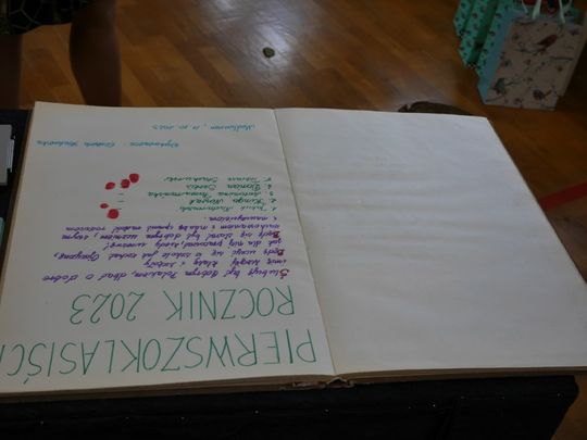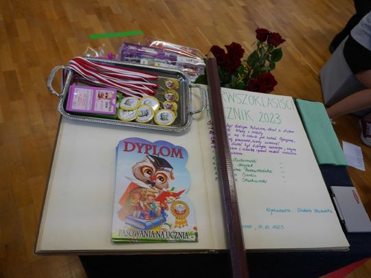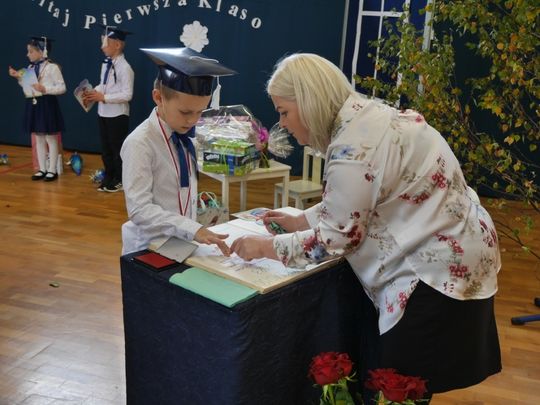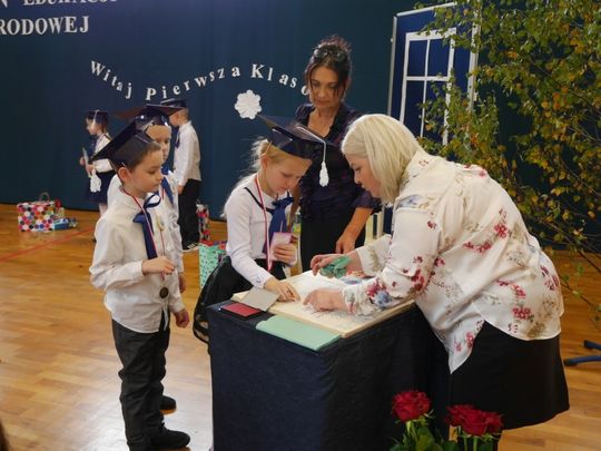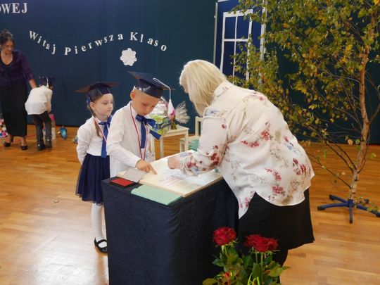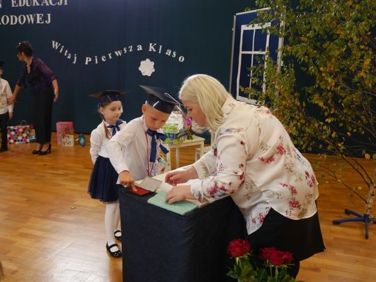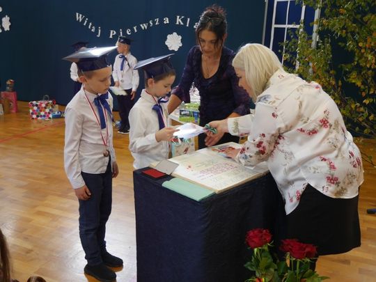 Po tym artystycznym wstępie odbyło się już formalne ślubowanie i oficjalne przyjęcie do szkolnej społeczności w tym okolicznościowe prezenty, pasowanie na ucznia oraz złożenie „podpisu” w księdze pamiątkowej szkoły.