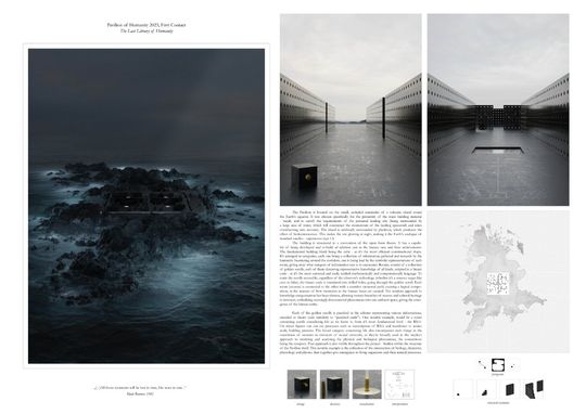 Mówi student Architektury ZUT, Michał Pietrusiewicz: „Naszym pomysłem było zaprojektowanie przestrzeni, pełniącej funkcję biblioteki - archiwum wiedzy ludzkiej. Forma zapisu informacji umieszczona jest w wykonanych ze złota rolkach (zwojach), które zamknięte są w granitowych sześcianach, budujących całą, przekształcalną strukturę przestrzenną. Wybór najszlachetniejszych materiałów na Ziemi jest odpowiedzią na główny problem przechowywania informacji - czas i rozkład. System kształtowania przestrzeni nawiązujący do struktury neuronowej mózgu jest odzwierciedleniem procesów zachodzących w rozwoju naszego gatunku".