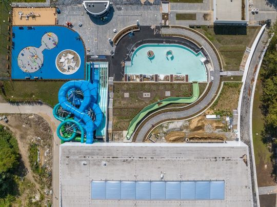i 11 zjeżdżalni o łącznej długości pół kilometra, w tym 77-metrowa zjeżdżalnia pontonowa, czy umożliwiająca szybką jazdę i współzawodnictwo zjeżdżalnia racer.