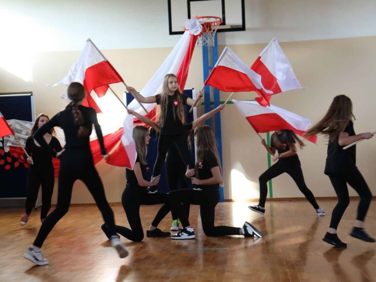 Uczniowie, pod opieką p. Anny Misikonis, przygotowali głęboki, pouczający i wzruszający spektakl, pt. "Dzieci Wrześni", który nawiązywał do tragicznego losu Polaków pod zaborami, do prób germanizacji i uprzedzeń narodowych. W trakcie spektaklu, młodzi aktorzy oddali hołd bohaterom z przeszłości, ukazując ich walkę o tożsamość narodową i niepodległość Polski. Ważnym punktem spotkania był również widowiskowy taniec, w którym uczniowie prezentowali biało-czerwone flagi. Tańcząc z pasją i zaangażowaniem, symbolizowali jedność i dumę narodu polskiego. Na koniec, jak co roku, nie zabrakło wspólnego śpiewu pieśni patriotycznych. „Rota”, czy „Szare szeregi” dodały uroczystości jeszcze większego ładunku emocjonalnego.