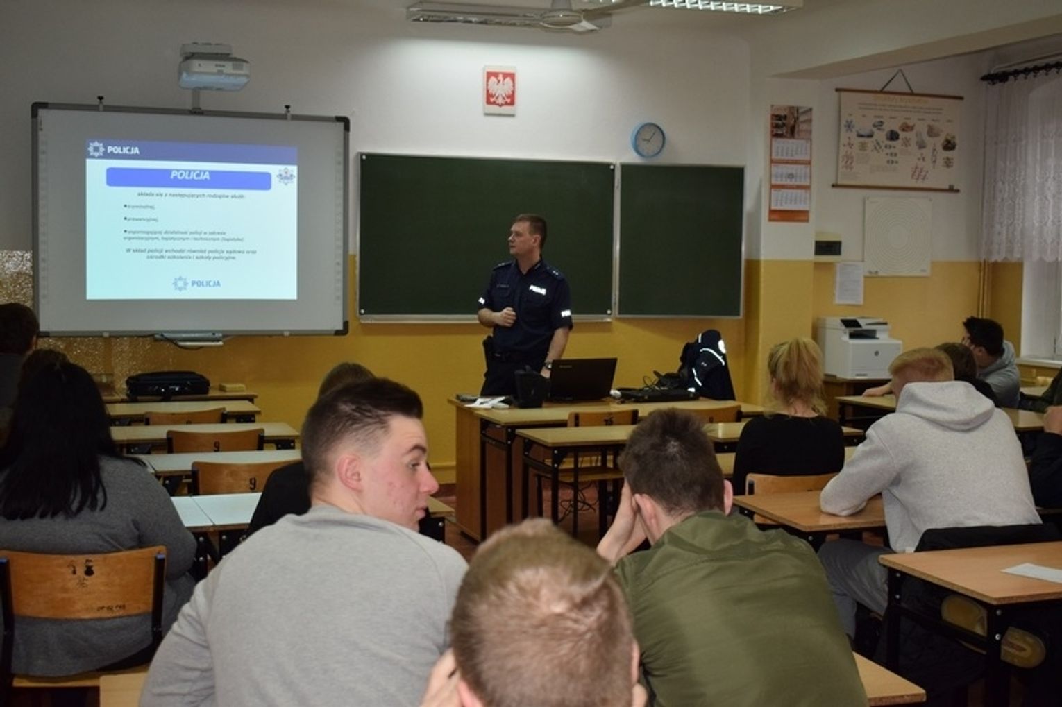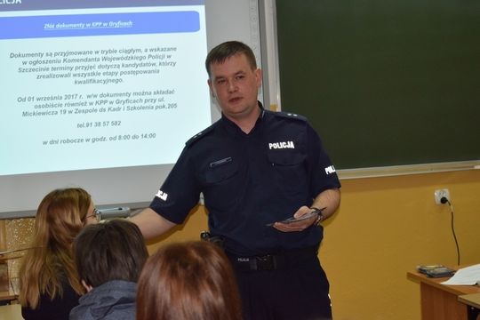 Oferta służby w policji skierowana jest szczególnie do ludzi młodych, dlatego w ubiegłym tygodniu policjanci z Gryfic spotkali się m.in. z uczniami Zespołu Szkół Ponadgimnazjalnych im. Czesława Miłosza w Gryficach. Mundurowi przekazywali informacje dotyczące doboru do służby, szczegółowo omawiając poszczególny etapy postępowania kwalifikacyjnego.