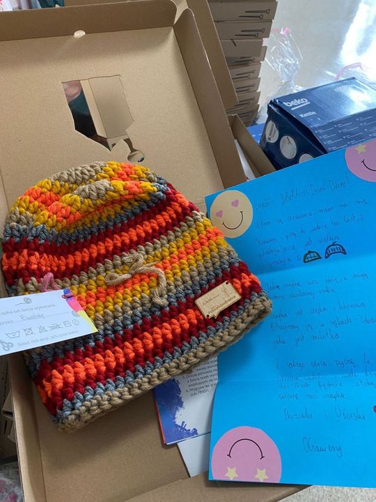 i rodzica oraz odręcznie napisany list od Wolontariusza. Czapki są niezwykle kolorowe, radosne