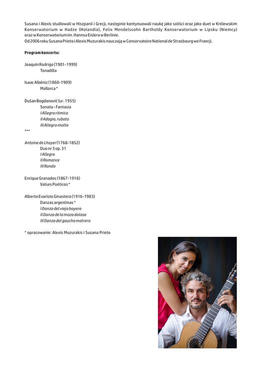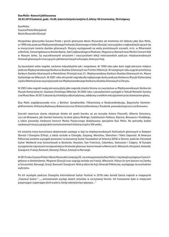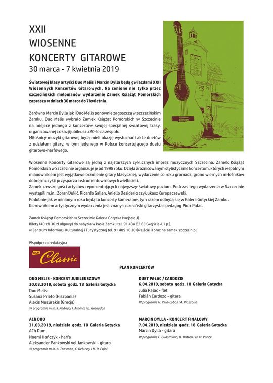 W tym roku koncerty otworzy występ Duo Melis - hiszpańskiej gitarzystki Susany Prieto i greckiego gitarzysty Alexisa Muzurakisa. Artyści w 2019 r. świętują 20. rocznicę powstania Duo Melis. Z tej okazji przygotowali światową trasę. Wystąpią w tak prestiżowych miejscach, jak Concertgebouw w Amsterdamie czy Megaron (Grecja). Zagrają recitale we Francji, Włoszech, Norwegii, Grecji, Rumunii, Szwajcarii i Polsce (w tym koncert na Zamku w Szczecinie). Na Zamku koncertować będą już po raz kolejny. Klimat tego miejsca i poziom Wiosennych Koncertów Gitarowych spowodowały, że artyści wpisali Szczecin na listę miejsc swojej jubileuszowej, światowej trasy. W jej ramach wystąpią nie tylko w Europie, ale także w krajach Azji i Ameryki Północnej.