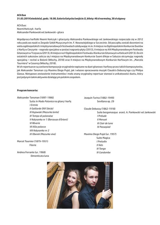 W drugim dniu Wiosennych Koncertów Gitarowych – w niedzielę 31 marca – w szczecińskim Zamku usłyszymy Ach Duo, czyli harfistkę Noemi Hańczyk i gitarzystę Aleksandra Pankowskiego vel Jankowskiego. Nietypowe zestawienie instrumentów i mało znany oryginalny repertuar stanowi o unikatowości duetu, który jest jedynym takim aktywnie działającym polskim zespołem.