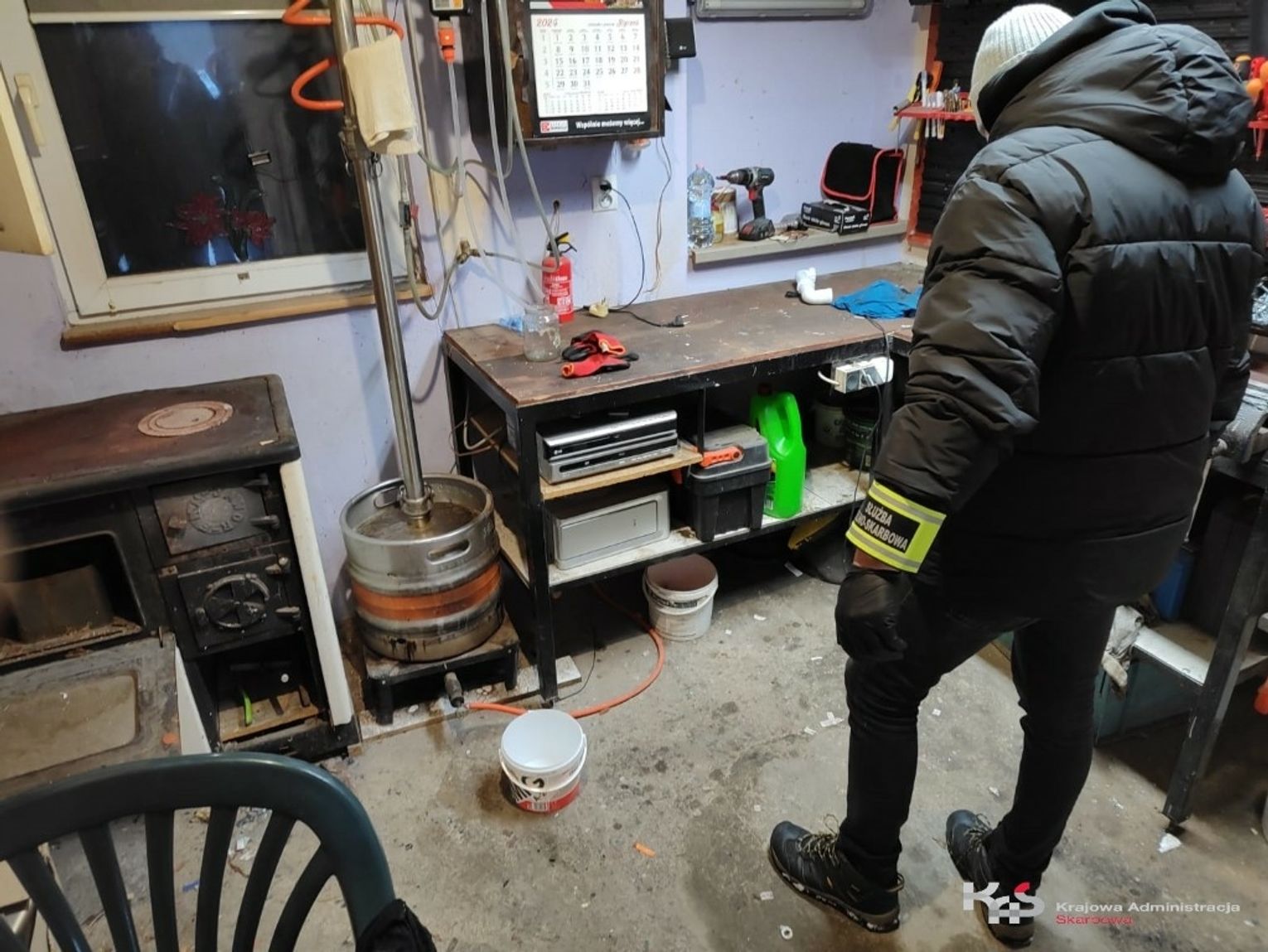 Funkcjonariusze KAS skontrolowali posesję w jednej z miejscowości powiatu białogardzkiego, gdzie produkowany był nielegalny alkohol. Pomysłowy „przedsiębiorca” ulokował swoją linię produkcyjną w pomieszczeniu gospodarczym.