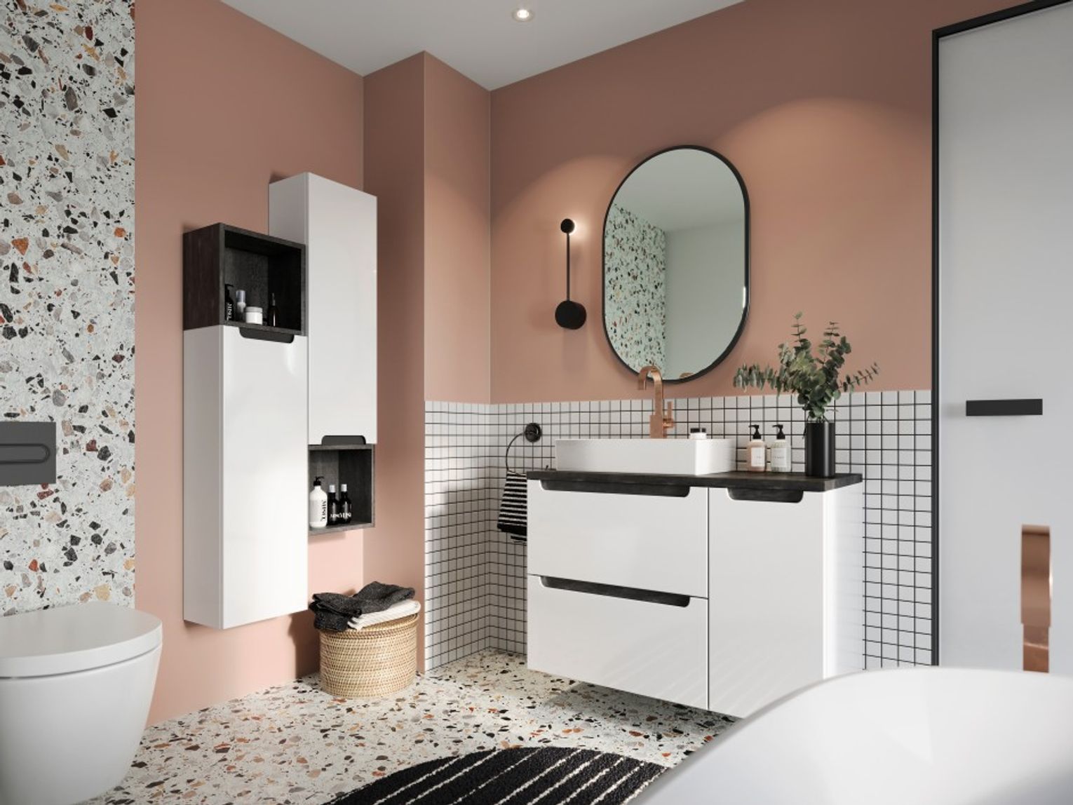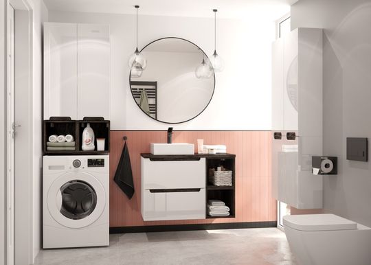 Peach Fuzz doskonale łączy się z wieloma kolorami. Bezpiecznym zestawieniem będą neutralne beże i biel, ale możemy zdecydować się również na bardziej zdecydowane kolory, takie jak granat, czerń lub brąz, które wprowadzą do wnętrza kontrast i dynamikę. Ciekawy efekt aranżacyjny uzyskamy decydując się na białe meble z kontrastowymi dodatkami, jak te z kolekcji Stilla marki NAS. Meble te posiadają ozdobne blendy w trzech odcieniach do wyboru (biel, buk truflowy i czarny beton), które urozmaicają nowoczesny design brył. Białe szafki z dekorem czarnego betonu i blatami w tym samym wykończeniu stworzą ciekawy i niebanalny efekt aranżacyjny na tle ścian w kolorze brzoskwiniowym. Meble z kolekcji Stilla są modułowe, co oznacza, że łącząc poszczególne elementy, np. szafki podumywalkowe czy szafki wiszące, możemy tworzyć pojemne komody i szafy. Seria oferuje meble w wielu wymiarach, w tym blaty, nóżki i umywalki, z którymi kompleksowo urządzimy łazienkę niemal jak na zamówienie.