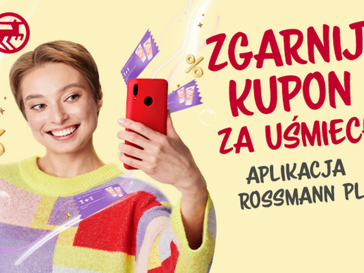 Od wtorku 20 lutego na użytkowników aplikacji Rossmann PL (zarejestrowanych w Klubie Rossmann) czekają kupony rabatowe z bardzo atrakcyjnymi promocjami: 1+1, 2+1 lub 2+2. Żeby je zdobyć, wystarczy wybrać odpowiedni kafelek w apce i uśmiechnąć się do własnego smartfona. Po chwili wyświetli nam się informacja o specjalnej ofercie. Kupon można zrealizować w drogerii stacjonarnej do końca danego dnia. Każdego dnia (z wyjątkiem niedziel i świąt) od godziny 6:00 można, uśmiechając się do telefonu, zdobyć nowy kupon, z innymi produktami.