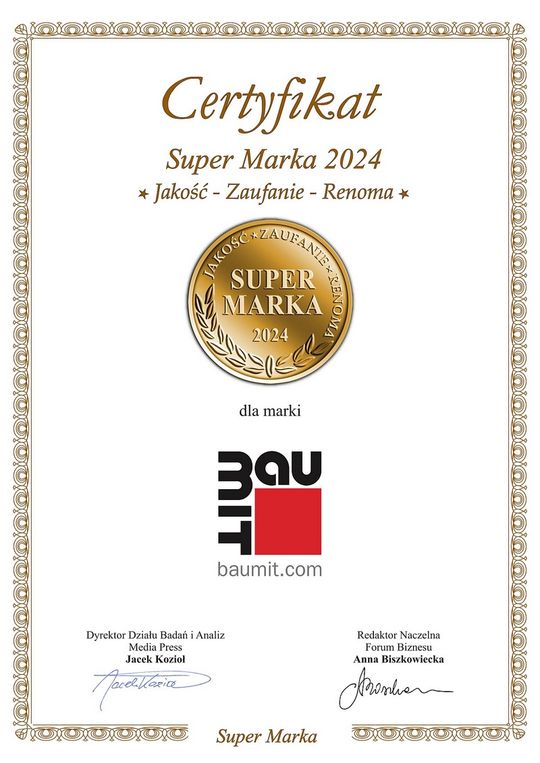 Tytuł „Super Marka" to nagroda specjalna, przyznawana brandom, które trzeci rok z rzędu zostały wysoko ocenione w plebiscycie konsumenckim „Dobra Marka". Redakcja Forum Biznesu bierze pod uwagę takie kryteria jak pozycja rynkowa poszczególnych marek i ich progres, oferowaną jakość produktów lub usług, a także stopień zaufania klientów. W kategorii „producenci materiałów budowlanych” nagrodę w tym roku otrzymała firma Baumit, która jednocześnie świętuje 30-lecie obecności na polskim rynku.
