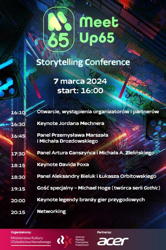 MeetUp65: Storytelling Conference to okazja do spotkania dla twórców z różnych dziedzin kultury i rozrywki – od gier komputerowych, przez film, aż po literaturę. W jej sercu leży sztuka narracji, proces kształtowania opowieści, które przenoszą nas w inne światy. Uczestnicy, niezależnie od wykorzystywanego medium, dzielą się wspólną pasją: opowiadaniem historii, które potrafią zachwycić, wzruszyć, a czasem nawet zmienić sposób, w jaki postrzegamy rzeczywistość.