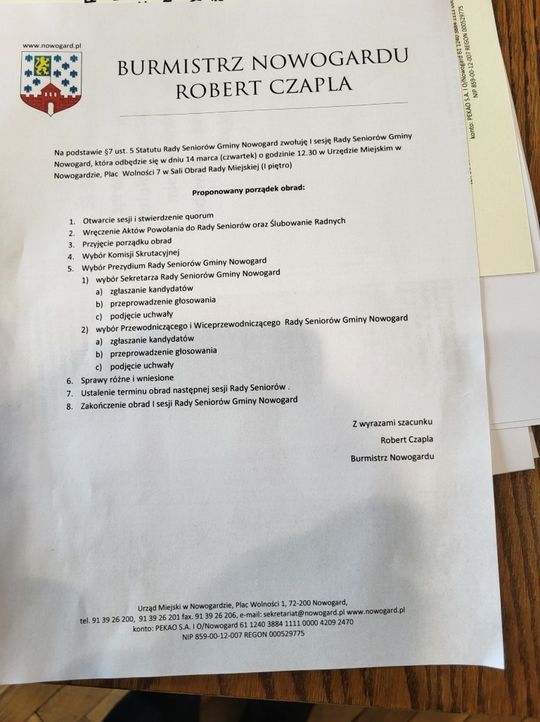 Głównym punktem porządku obrad było wręczenie przez burmistrza Roberta Czaplę Aktów Powołania do Rady Seniorów oraz Ślubowanie Radnych.