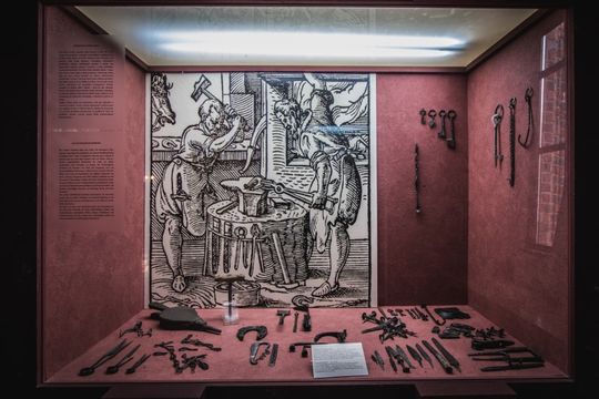Products of specialized craftsmen of Szczecin started to appear in greater numbers after the city location, which began in 1237–1243. In the exhibition cases, resembling mediaeval tenements, a wide range of shoemakers', fishing, blacksmithry, coopery and pottery wares from 13th-17th centuries are presented, and beside models of mechant ships used when the city belonged to the Hansa, there can be seen attributes of salesmen and some of goods sold by them in Szczecin.
