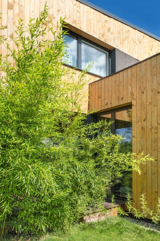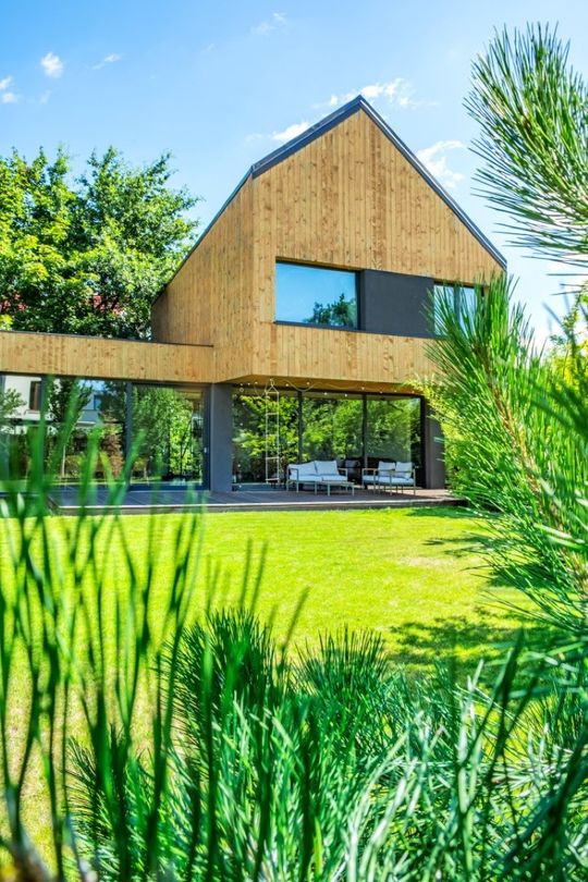 W efekcie powstała drewniana bryła z fragmentami murowanymi. Na parterową, zasadniczą część budynku nałożono piętro z dachem dwuspadowym, osiągając efekt nowoczesnej stodoły. Pawilon piętra został przewieszony przez linie szklenia salonu, w czego efekcie wytworzyła się strefa tarasu z zadaszeniem osłaniającym przed nadmiernym nasłonecznieniem czy opadami. Poprzez przekręcenie i zejście z osi głównej kalenicy dachu spadowego powstała bryła, która jest delikatnie asymetryczna, nieregularna, co potęguje dynamikę budynku. Natomiast ściany zewnętrzne domu zaprojektowano w taki sposób, by stanowiły tło dla roślinności, tworząc imponującą scenografię ogrodową, integrującą dom z krajobrazem.