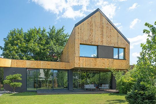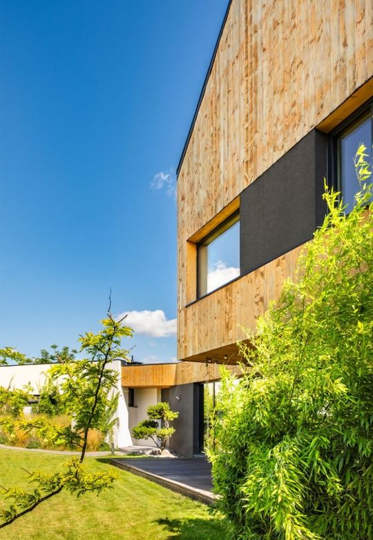 Działka z niewielkimi drzewami stanowiła dla architektów ramę, w której osadzili nowy budynek jednorodzinny. Połączenie drewna z bielą, grafitową szarością oraz otaczającą dom zielenią pozwoliło na stworzenie spójnej, eleganckiej przestrzeni.
