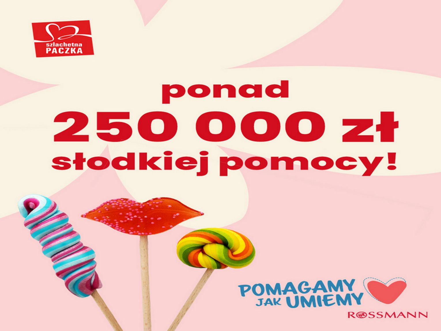 Pomaganie z Rossmannem jest słodkie – tak samo jak satysfakcja z robienia czegoś dobrego dla ludzi w potrzebie. Przekonali się o tym klienci drogerii Rossmann, którzy już ósmy rok z rzędu z chęcią zaangażowali się w akcję zakupu lizaków, wspierającą działanie Szlachetnej Paczki. W tym roku na rzecz inicjatywy przeznaczone zostanie ponad 250 tys. zł.