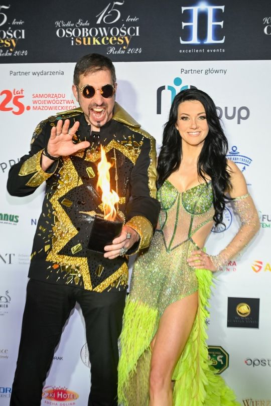 Marcin Muszyński podczas Gali prezentował się oczywiście jak na rasowego showmana przystało. Zaznaczył również swoją obecność podczas zdjęć na ściance, gdzie pozował między innymi z Dodą, Królową Polskiej Sceny Muzycznej, dla której nie ma rzeczy niemożliwych i jako jedyna Wokalistka na Świecie Śpiewała Lewitując – za sprawą Marcina Muszyńskiego zresztą. Aczkolwiek trzeba przyznać, że Dorota Rabczewska miała tego dnia konkurencję! Równie duży zachwyt wywołała wśród obecnych uroda oraz kreacja żony Iluzjonisty. Ewelina Muszyńska z gracją nosiła zieloną suknię, w której mogłaby bez problemu zwyciężyć w zawodach Miss, a na zdjęciach promieniuje szczęściem i energią. Mimo upływu lat od wygranych przez Ewelinę wyborów Miss Slav w Paryżu, mamy wrażenie że żonie Iluzjonisty lata nie przybywają… czy to sprawka czarów Marcina?