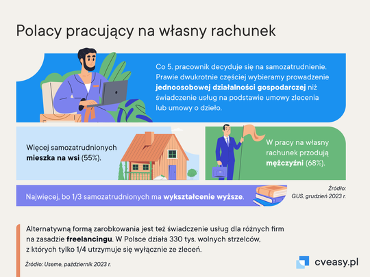 Zgodnie z raportem CBOS z grudnia 2023 r. 12% pracujących zarobkowo Polaków prowadzi własną działalność gospodarczą, a kolejnych 7% czerpie dochody z tytułu umów zlecenia lub umów o dzieło. Nie brakuje też osób, które traktują samozatrudnienie jako dodatkowe źródło dochodów – dane GUS mówią, że do etatu dorabia 231 tys. Polaków, najczęściej w usługach.