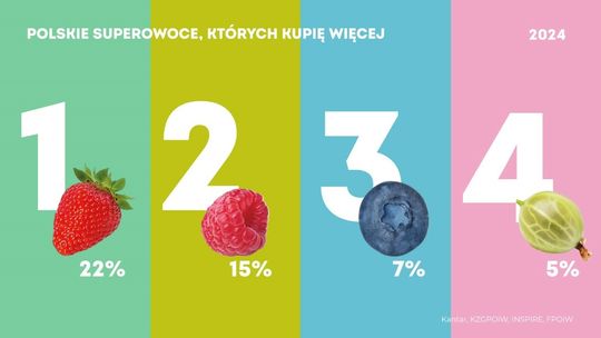 Truskawka jest wręcz symbolem sezonowości i lata. To wskazania więcej niż połowy (56%) Polaków. Podsumowujące sezon badania wskazują także: czereśnie (45%), maliny (44%), wiśnie (33%), polską borówkę (23%), przezywający drugą młodość agrest (20%), coraz bardziej dostępną czerwoną porzeczkę (18%), czarna porzeczka (17%), gruszkę (16%), jeżynę (16%), także aronię i rokitnik.