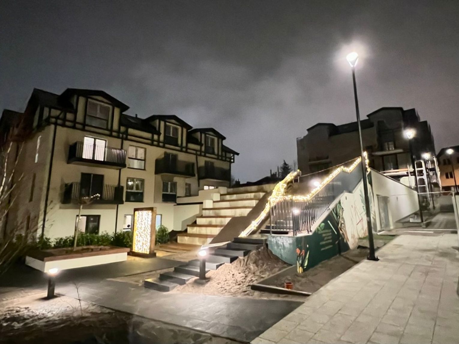 Spadek terenu, na jakim znajduje się STORIA, został wykorzystany do stworzenia dwóch stref ogólnodostępnego patio. Na górnym tarasie znajdują się zadaszone konstrukcje do sąsiedzkich spotkań oraz huśtawka, a na dolnym poziomie stworzono zaciszne miejsca wypoczynku z fontanną. Oba tarasy atrialnego patio łączą Stopnie Towarzyskie i Schody Inspiracji Literackich oraz meandrująca wśród zieleni zjeżdżalnia – przygotowana z myślą nie tylko o dzieciach. Całość wypełniona jest atrakcyjnie zaaranżowaną roślinnością, obejmującą kwiaty, krzewy oraz wysokie drzewa.
