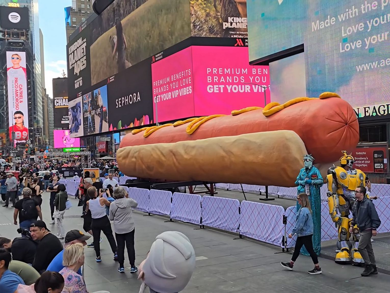Hot dog ma 20 metrów długości. W jasnej bułce znajduje się parówka ozdobiona z wierzchu musztardowym szlaczkiem. Już samo to przykuwa wzrok każdego przechodzącego Times Square w Nowym Jorku. Ale to nie koniec, bo codziennie w południe hot dog podnosi się niemal do pionu i w górę wystrzeliwuje salwę konfetti.