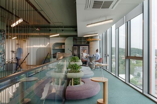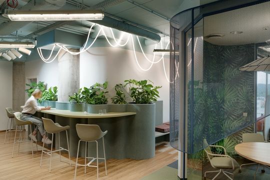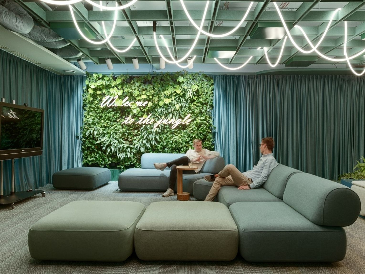 Na każdym kroku na użytkowników biura czekają bujne rośliny i wszechobecna zieleń. Zielona ściana w strefie dżungli z ledonem, nieregularne morficzne donice przy blatach, drzewo w stole w strefie spotkań to tylko niektóre z miejsc, w których znajdują się żywe zielone akcenty. Każda zabudowa ma miejsce na donice, w strefie kinowej przewidziano też stalowe donice pod sufitem, które wkomponowują się w kratownicę z akustycznego materiału, a zwisające rośliny zostały podkreślone świetlnymi lianami, swobodnie zwisającymi z góry. W biurze na pracowników czekają również donice z ziołami, gdzie pracownicy mogą znaleźć świeżą miętę, rozmaryn, szałwię i bazylię, które nie tylko urozmaicają smak przygotowywanych przez nich potraw, ale zapewniają także niespotykany w biurach zapach! W każdej z nowo projektowanych stref zaplanowaliśmy zieleń, czy to na nowo powstałych okładzinach słupów i półkach dokoła nich, czy w wbudowanych donicach w siedziska, które rozrastając się w większe krzewy i drzewa mają tworzyć klimat ławek i stolików w parku – podkreśla Justyna Biłat.