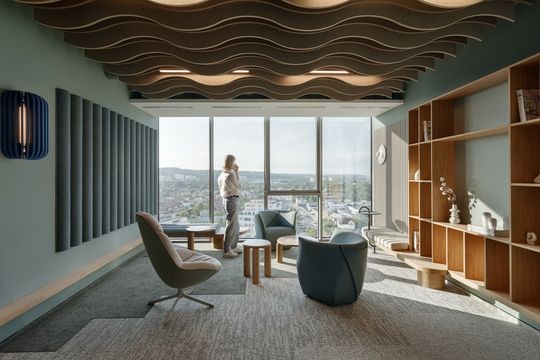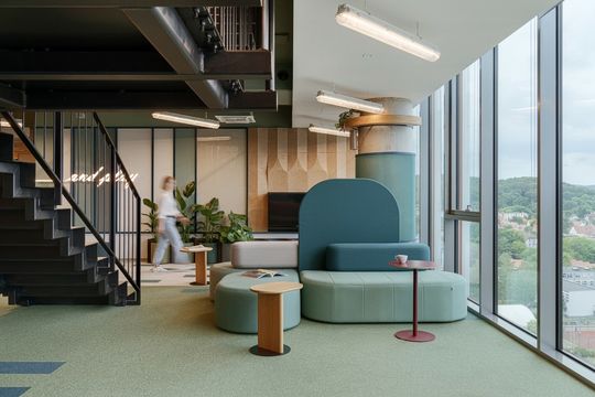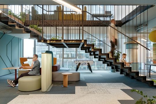 W każdej strefie przy schodach pracownicy mają też do dyspozycji biurka z bieżniami, jest też strefa fit gdzie zaprojektowana została ścianka wspinaczkowa, rowery stacjonarne, drążki do ćwiczeń, a nawet worek bokserski. W biurze znajduje się aż 55 sal do spotkań, a każda z nich ma swój indywidualny charakter. Zastosowano w nich designerskie panele, a lampy i zasłony akustyczne zapewniają znacznie podniesiony komfort ich użytkowania.