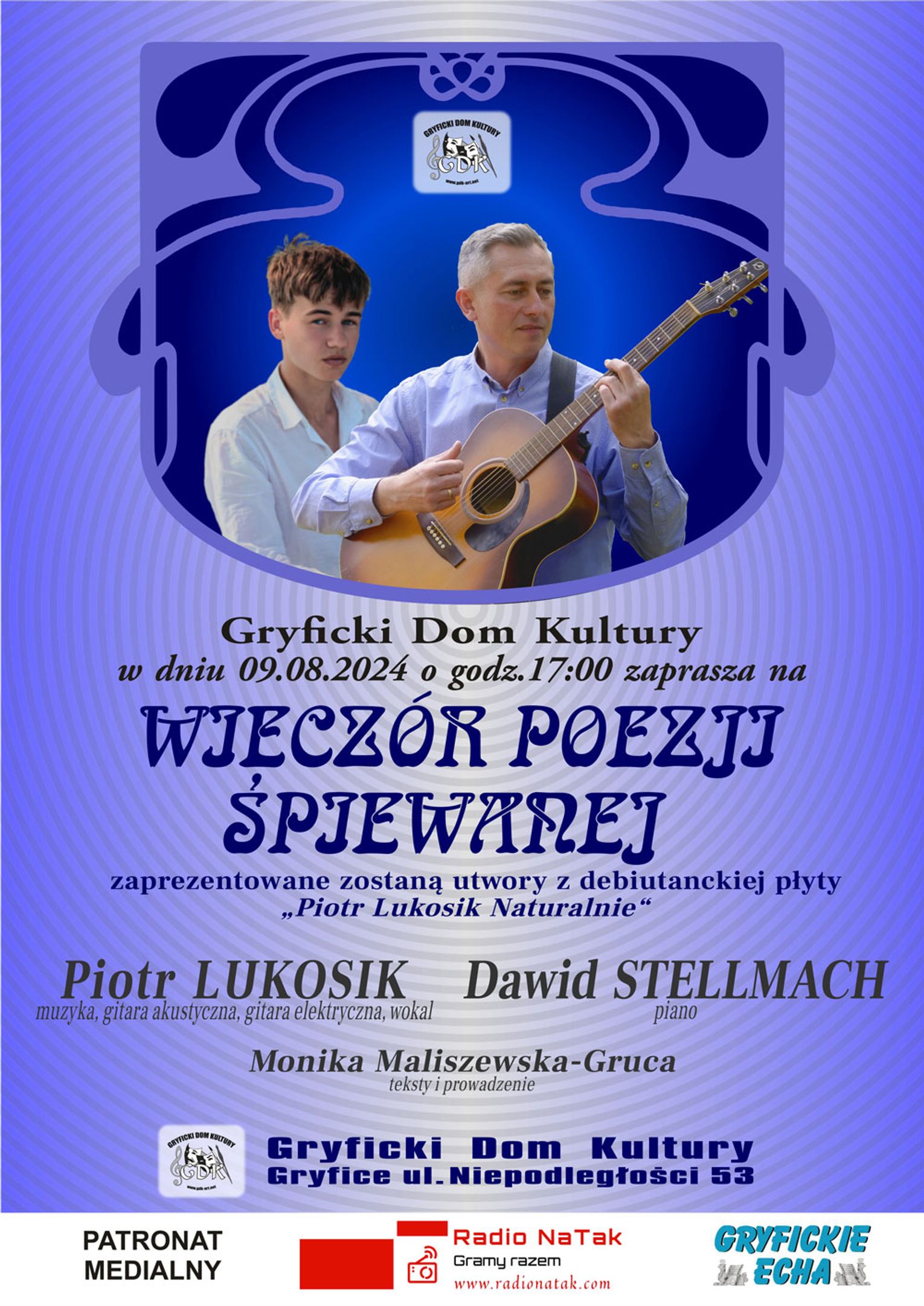 „...Poznaliśmy się w 2023 roku, kiedy Piotr zagrał koncert w zamku w Mosznej. Po koncercie porozmawialiśmy i nawiązaliśmy twórczą współpracę, która trwa do dzisiaj - mówi Monika Maliszewska-Gruca. W zeszłym roku Piotr zagrał również koncert w domu kultury w Gryficach i to właśnie gryficka Publiczność jako pierwsza motywowała Piotra do nagrania płyty. Po roku – Piotr Lukosik wraca do nas – już z płytą! W trakcie koncertu będą mogli Państwo usłyszeć utwory z płyty, a także kompozycje zupełnie nowe. Koncert poprowadzi Monika Maliszewska-Gruca, autorka większości tekstów prezentowanych utworów.