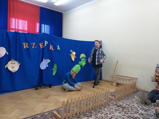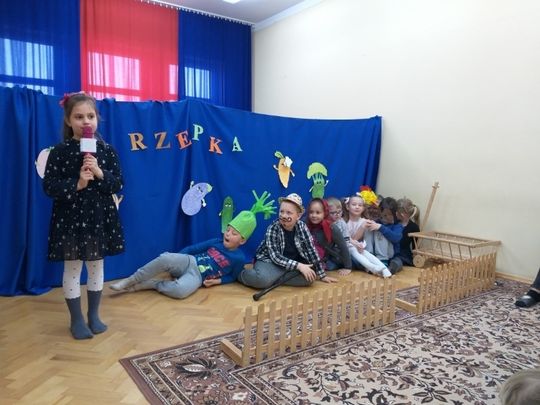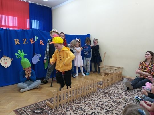 Nasze dzieci często mają okazję brać udział w przedstawieniach teatralnych zarówno na terenie placówki, jak i tych wyjazdowych. Jednak 05.04. obejrzały spektakl wyjątkowy. Dzieci z grupy 0 A i 0 B przedstawiły przygotowaną pod okiem pani B. Harewskiej i pani Marzeny Ciesielczyk inscenizację utworu „ Rzepka”. Wszyscy byli pod wrażeniem wspaniałej gry naszych małych aktorów i nagrodzili ich rzęsistymi brawami.