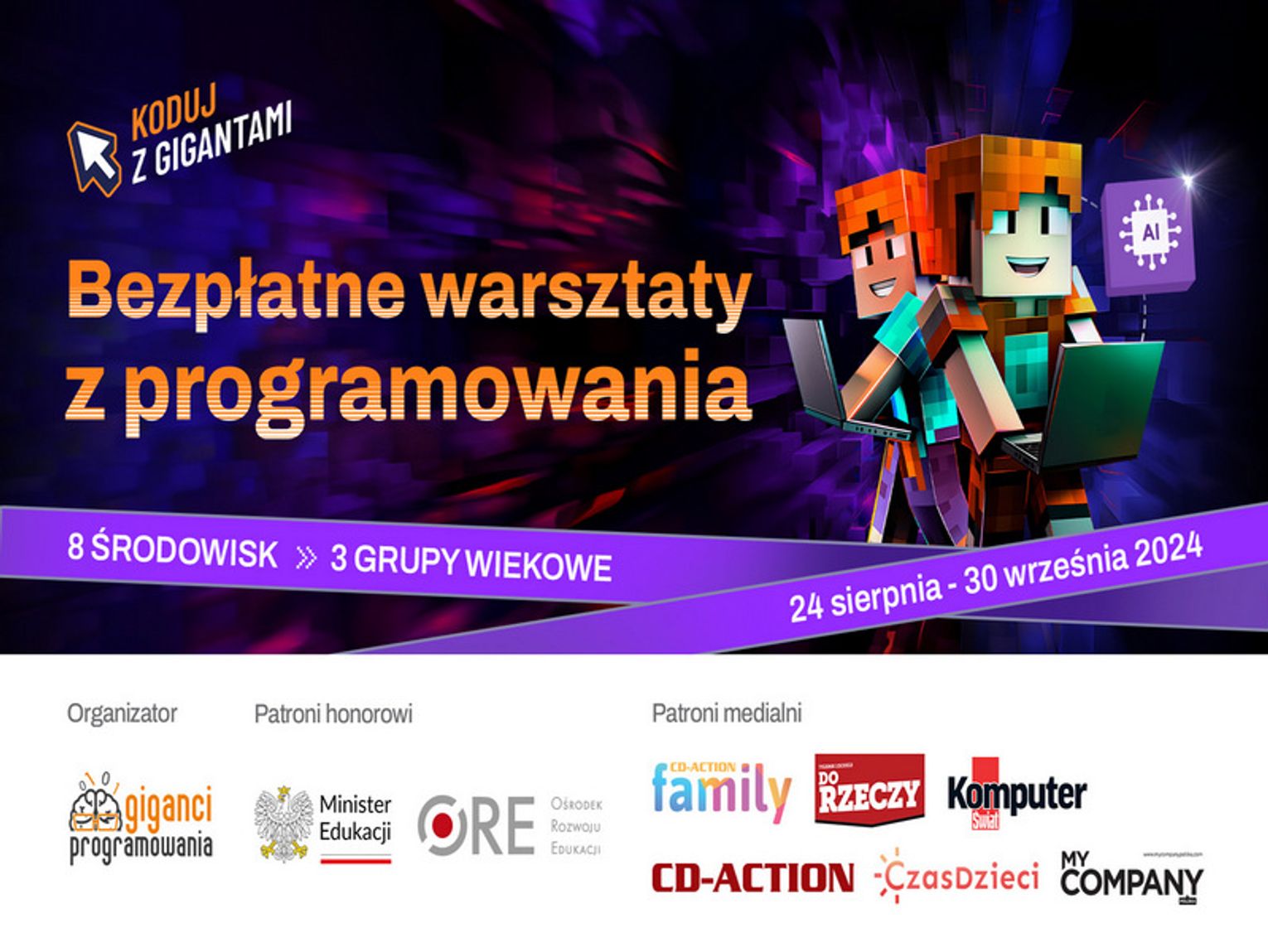 - Giganci Programowania zapraszają na 15. edycję bezpłatnych warsztatów z programowania - Koduj z Gigantami. Już teraz każdy może zapisać swoje dziecko na zajęcia w ramach najnowszej odsłony wydarzenia. Tym razem tematem przewodnim jest hasło “Cyber Przygoda w świecie AI”.