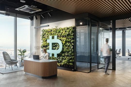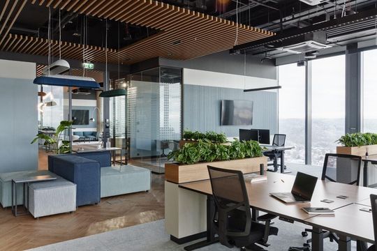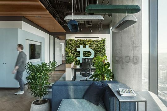 W biurze Deribit architekci postawili na czerpanie z natury pełnymi garściami. Na podłodze i ścianach zaproponowali żywe rośliny, jasne naturalne drewno, błękity nieba, morskie turkusy, ciepłe szarości i dodającą elegancji czerń. Jak podkreśla Justyna Biłat, w tak wyjątkowej przestrzeni także wysokość ma znaczenie: Aby nie ograniczać widoków specjalnie unikaliśmy zastosowania podwieszanych sufitów, a jedynymi zwieszanymi elementami są delikatne belki oświetleniowe i lampy akustyczne nad strefą modułowych mebli – puf i kanap. Dodatkowo każda wolna powierzchnia jest wykorzystana w grze o komfort akustyczny. Na ścianach i we wnękach meblowych znajdziemy akustyczne materiały, które również wizualnie dodają głębi całej przestrzeni.