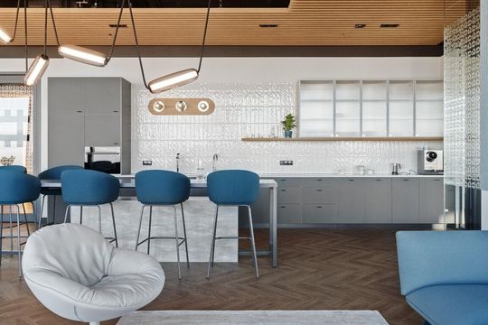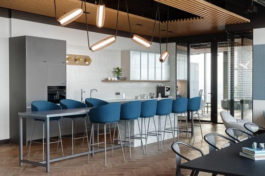 Sercem biura jest welcome area, w której znajduje się jedynie filigranowa lada, za którą znalazła się podświetlona ściana zieleni. W ten sposób nie została wytworzona bariera i wrażenie niedostępności pomiędzy community menagerem a pracownikami i gośćmi biura. Welcome area to także centralne miejsce biura, w którym codziennie odbywają sięspotkania całego zespołu firmy. W jego pobliżu znajduje się minimalistyczna kuchnia, gdzie przygotowana została wyspa. To wokół niej na wyniesionych w górę fotelach na wysokich nogach odbywają się spotkania pracowników w trakcie lunchu. Zastosowane w niej oryginalne oświetlenie zapewnia miękkie i ciepłe światło, dzięki czemu wszyscy mogą się tu poczuć jak w ulubionej kawiarni, hotelowym lobby czy w restauracji.