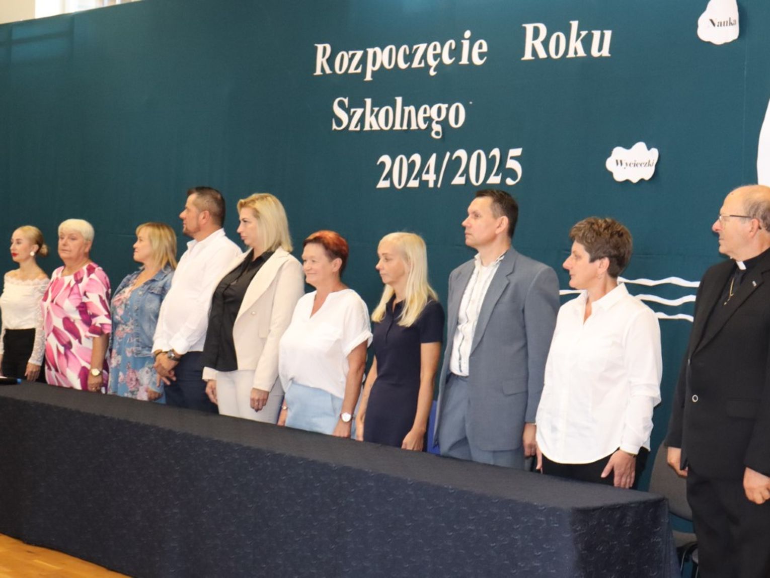Pani dyrektor Marzena Stępień serdecznie powitała wszystkich zgromadzonych, składając życzenia na nadchodzący rok. Wyraziła nadzieję, iż będzie to czas pełen sukcesów, spokoju i wspólnej pracy. Szczególnie ciepłe słowa skierowała do pierwszoklasistów, którzy w tym dniu rozpoczęli swoją szkolną podróż, życząc im wielu wspaniałych chwil i radości z odkrywania nowego. Rodzicom podziękowała za zaufanie i wsparcie, a nauczycielom życzyła satysfakcji z pracy i wielu sukcesów w nadchodzących miesiącach. W trakcie uroczystości pani dyrektor oficjalnie przedstawiła nowych członków kadry nauczycielskiej, którzy dołączyli do zespołu. Istotnym momentem uroczystości było również przekazanie sztandaru szkoły, co symbolicznie podkreśliło jedność i ciągłość szkolnej tradycji.