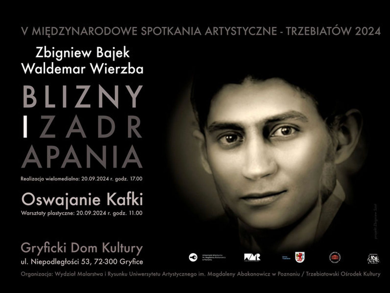 W 2024 r. minęła setna rocznica śmierci Franza Kafki, wizjonera mrocznej przyszłości Europy. Kontynent istotnie przeżył najtrudniejszy okres w swojej historii, ale podniósł się ku światłu. W twórczości Kafki także dużo jest promieni, dużo nadziei, dużo wiary w słuszną drogę. Zachęcamy do refleksji nad myślą pisarza, który miał tak wielki wpływ na na europejską i światową literaturę i sztukę. Pomoże nam w tym nowe tłumaczenie zbioru aforyzmów Franza Kafki „Rozważania o grzechu, cierpieniu, nadziei i słusznej drodze”, dokonane na potrzeby projektu przez Waldemara Wierzbę. Wysłuchamy jego interpretacji miniatur praskiego pisarza, poznamy ścieżkę dźwiękową przygotowaną przez Jacka Niepołomskiego interpretującego słowa Franza. Zaprosimy chętnych, niezależnie od wieku, do budowania autorskiego portretu Kafki. To wszystko będzie działo się w Gryficach i Trzebiatowie w ramach V Międzynarodowych Spotkań Artystycznych Trzebiatów 2024. „Blizny i zadrapania” to nie tylko alegoria współczesności, czasu izolacji, lęków przed obcymi, samotności w tłumie, w zgiełku komunikatów, w nadmiarze obrazów; to próba wyjścia im naprzeciw.