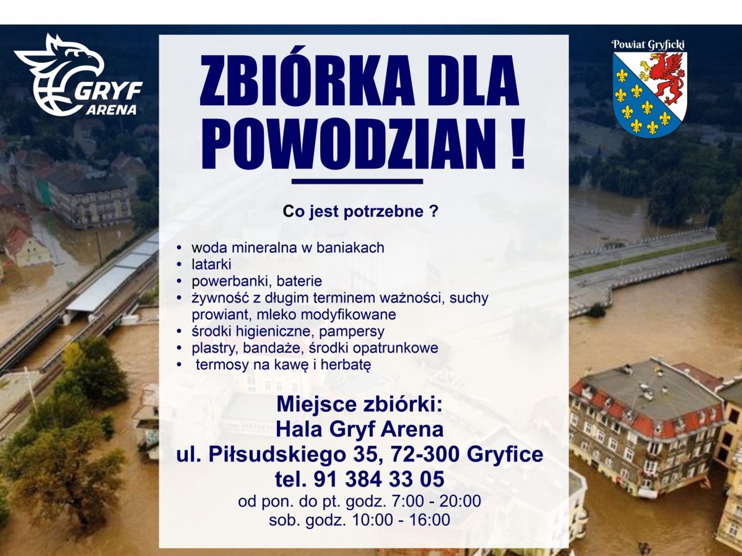 W związku z tragiczną sytuacją powodziową w Polsce, Powiat Gryficki rusza ze zbiórką najpotrzebniejszych w tej chwili rzeczy dla powodzian.