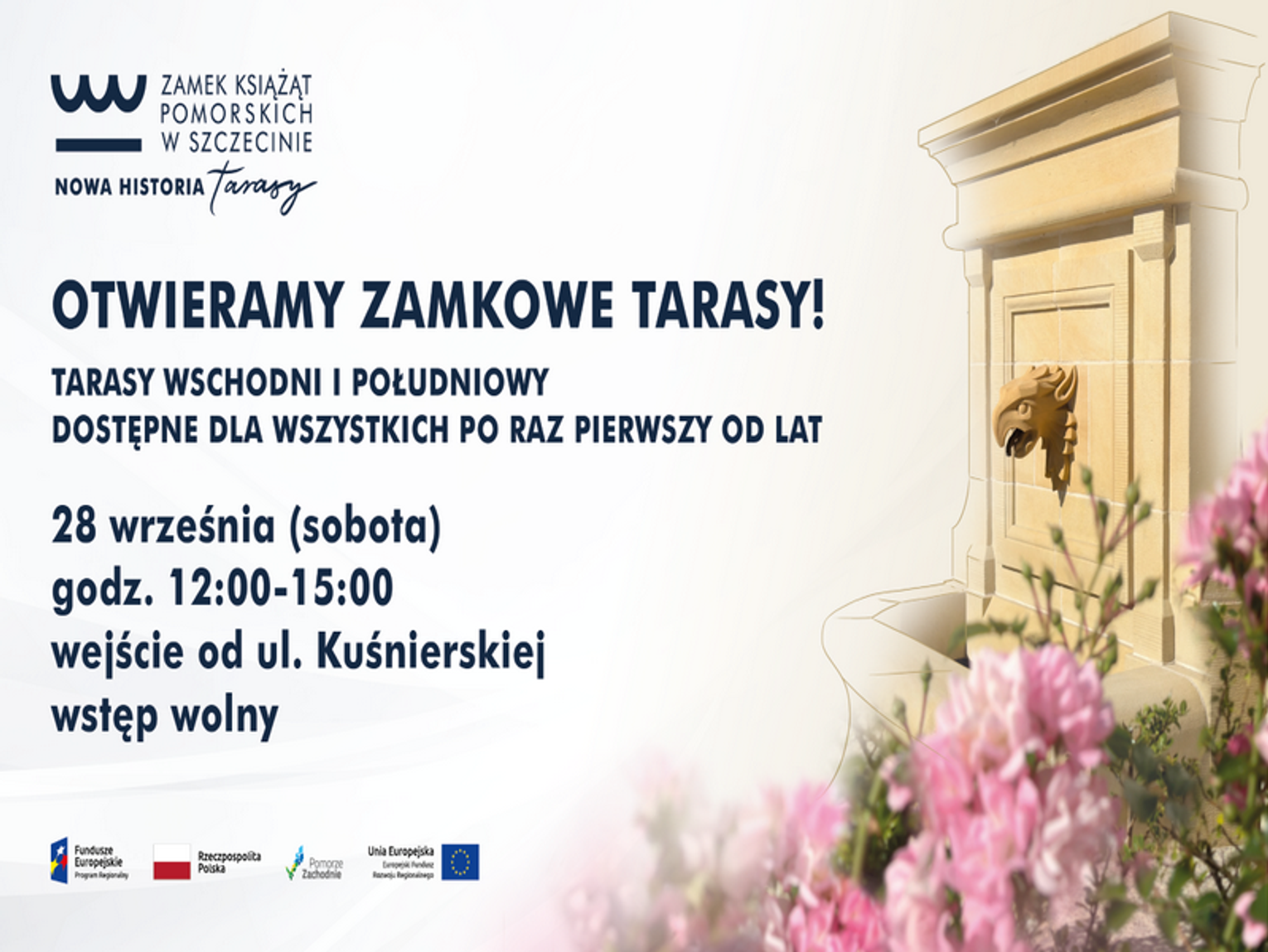 „Otwieramy zamkowe tarasy” – tak brzmi hasło sobotniej imprezy organizowanej przez Zamek Książąt Pomorskich w Szczecinie. W sobotnie popołudnie 28 września w godzinach od 12:00 do 15:00 Zamek zaprasza na zmodernizowane tarasy południowy (od ul. Kuśnierskiej) i wschodni (od strony Odry). Odwiedzający poznają efekty zakończonego I etapu zamkowej inwestycji - projektu „Kompleksowe zagospodarowanie tarasów Zamku Książąt Pomorskich w Szczecinie”, dofinansowanego z Regionalnego Programu Operacyjnego Województwa Zachodniopomorskiego 2014-2020.