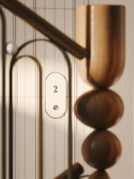Części wspólne, takie jak strefy wejściowe, korytarze czy klatki schodowe, zostaną wykończone wysokiej klasy naturalnymi materiałami, gwarantującymi trwałość i komfort użytkowania. Drewniane panele w ciemnym brązie, przełamane stalowymi akcentami, designerskie oświetlenie, miejsca wypoczynkowe oraz rzemieślnicze detale, takie jak metalowe balustrady i drewniane pochwyty, tworzą elegancką i nowoczesną przestrzeń.