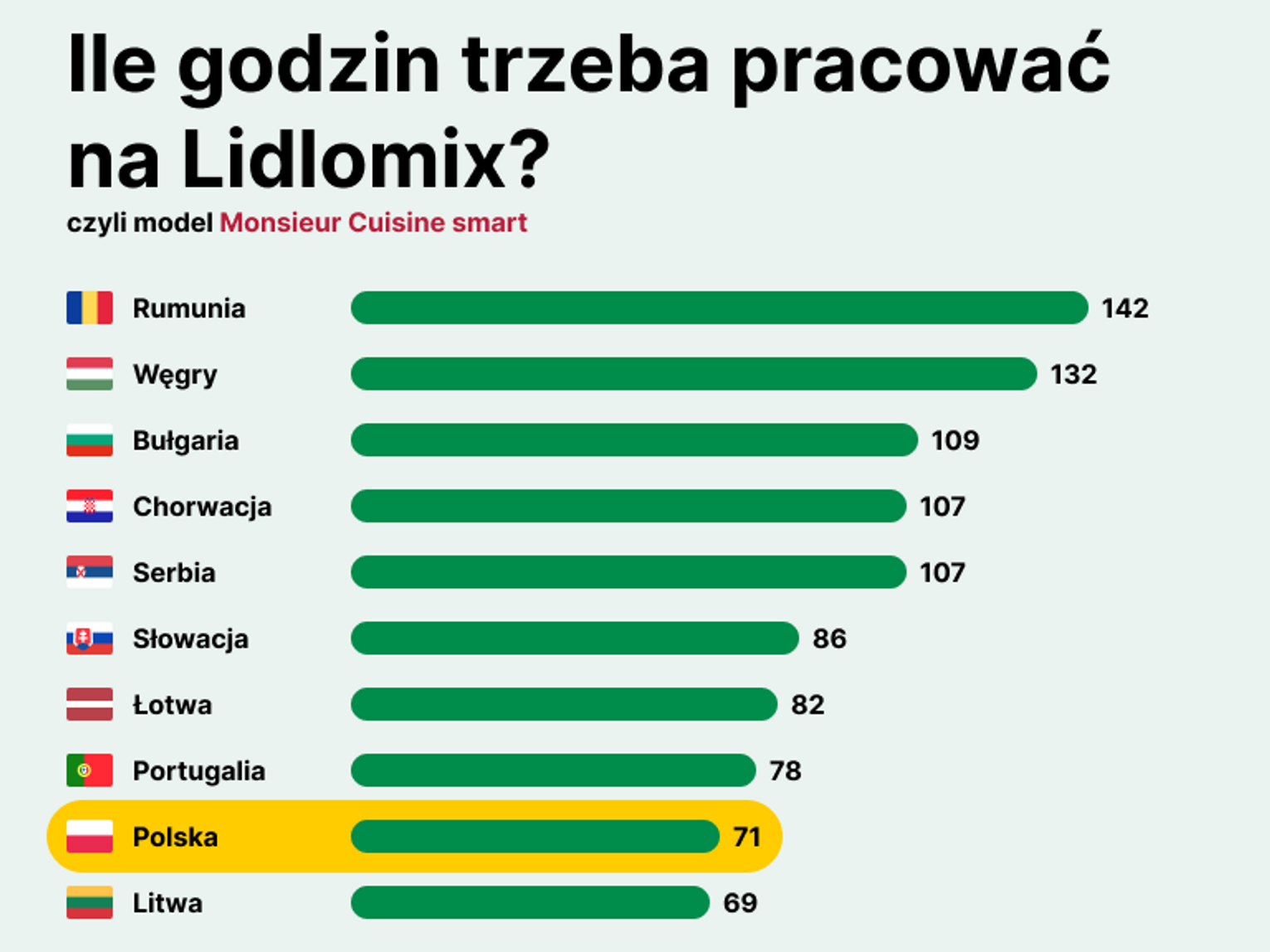 Natomiast najdłużej, bo więcej niż połowę etatu, na Monsieur Cuisine Smart muszą pracować mieszkańcy Słowacji, Serbii, Chorwacji, Bułgarii, Węgier i Rumunii. W ostatnim z wymienionych państw na Lidlomix można pozwolić sobie dopiero po przepracowaniu 142 godzin, czyli prawie 85% miesięcznego wymiaru godzin, co stanowi najwyższy wynik w naszym zestawieniu.