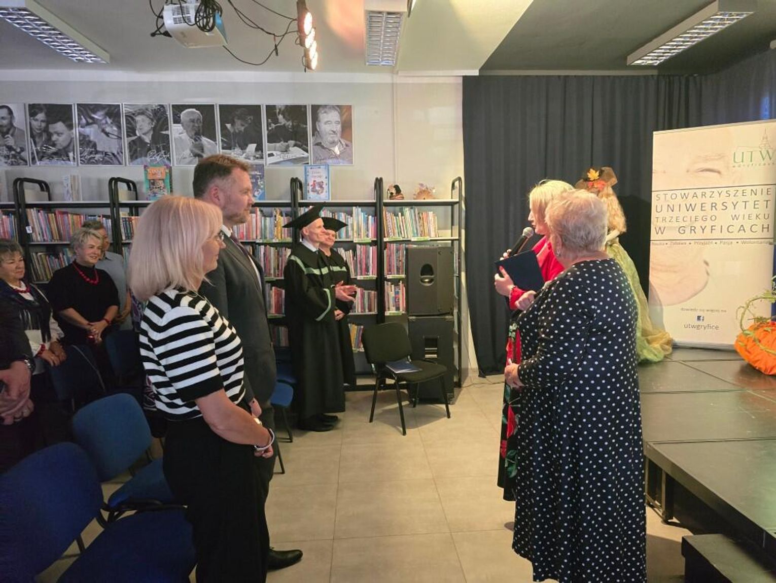 Przybyłych przywitał dyrektor MBP Przemysław Kubalica. W gronie licznie przybyłych gości burmistrz Gryfic Tomasz Aniuksztys, przedstawiciele współpracującej od lat z gryfickim UTW Politechniki Koszalińskiej – Wydział Humanistyczny prodziekan ds. kształcenia dr Iwona Zychowicz i prodziekan ds. studenckich dr Piotr Szarszewski, prodziekan ZPSB w Gryficach dr Agnieszka Jankowska, dyrektor GDK Konrad Wojtyła oraz Prezes zaprzyjaźnionego UTW z Golczewa Janina Kołodyńska.