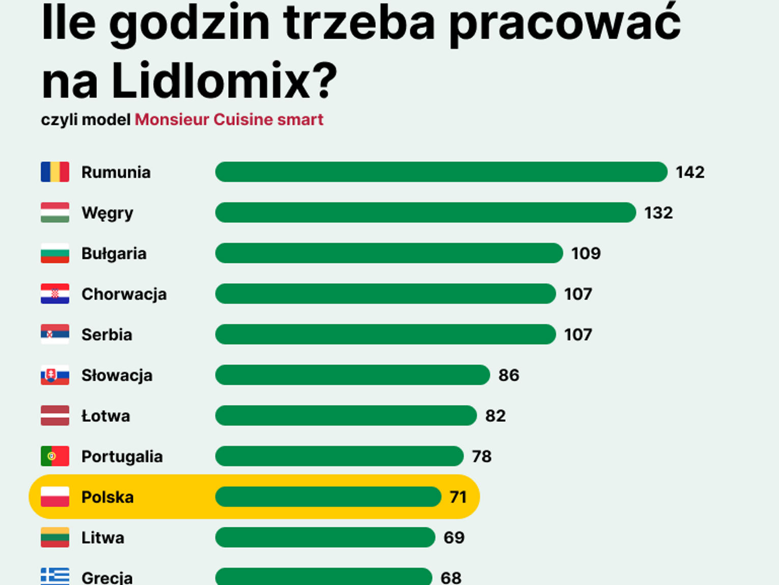 Natomiast najdłużej, bo więcej niż połowę etatu, na Monsieur Cuisine Smart muszą pracować mieszkańcy Słowacji, Serbii, Chorwacji, Bułgarii, Węgier i Rumunii. W ostatnim z wymienionych państw na Lidlomix można pozwolić sobie dopiero po przepracowaniu 142 godzin, czyli prawie 85% miesięcznego wymiaru godzin, co stanowi najwyższy wynik w naszym zestawieniu.