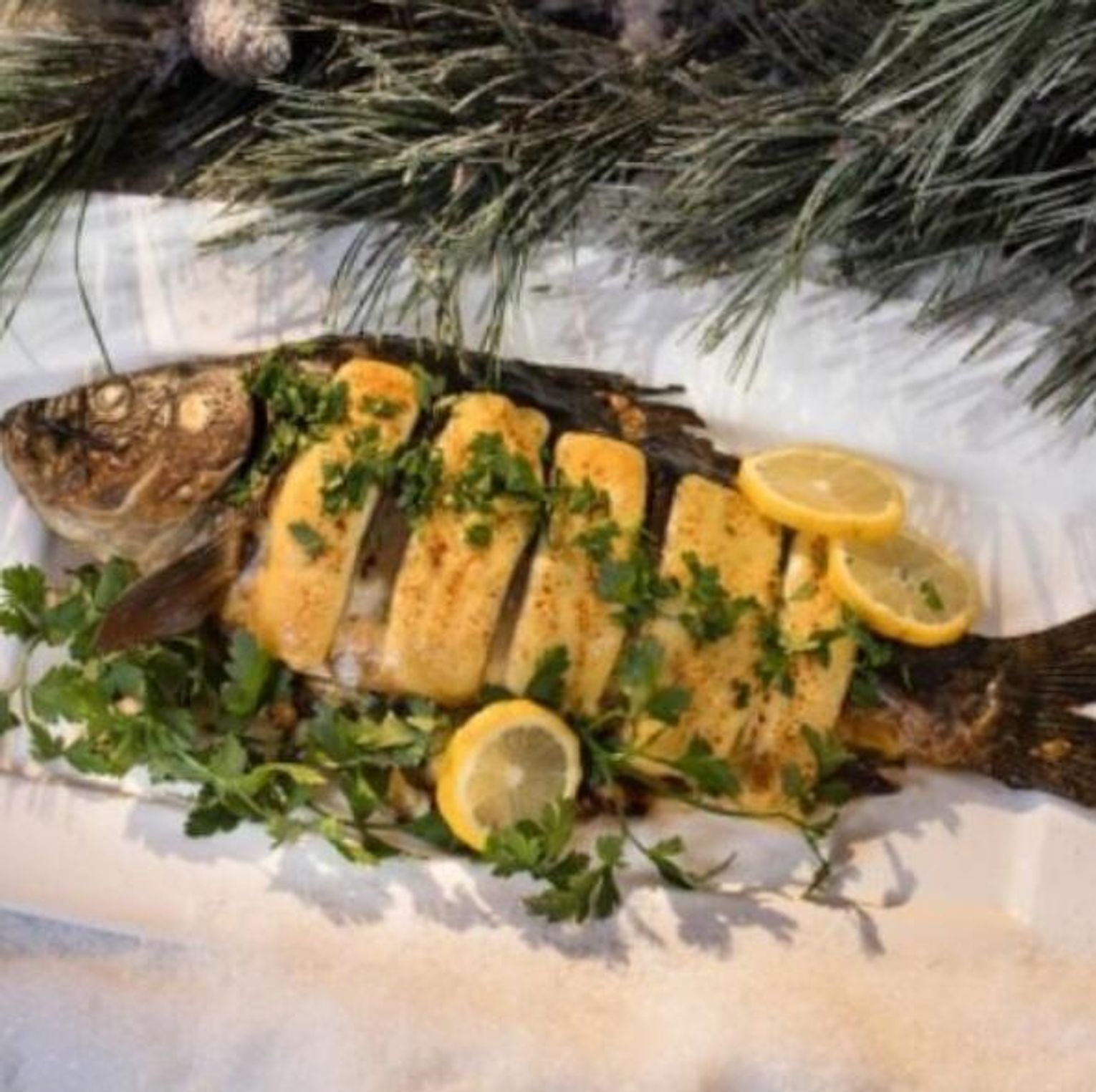 Pieczarki pokroić w cząstki, cebulę w kostkę i podsmażyć na oleju. Odstawić do wystygnięcia, a karpia doprawić solą i pieprzem. Do wystudzonych pieczarek dodać pokrojoną natkę, 80 gramów pokrojonego sera, oraz sól i pieprz do smaku. Całość dokładnie wymieszać i nafaszerować karpia, następnie natłuścić rybę odrobiną oleju. Piec w temperaturze 180°C przez godzinę. Piętnaście minut przed końcem pieczenia, na karpia położyć pozostałe