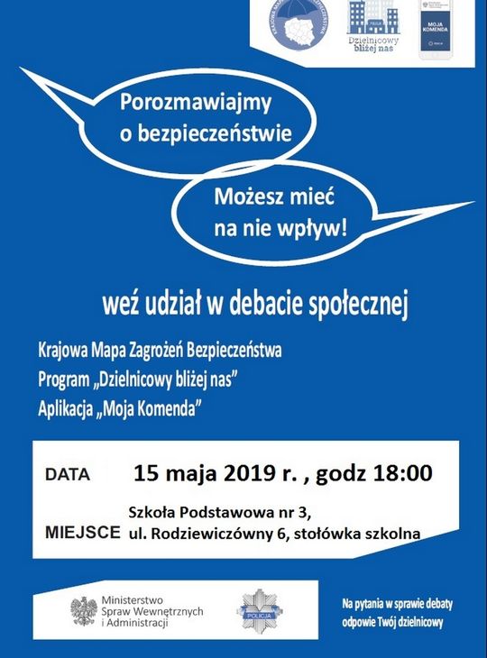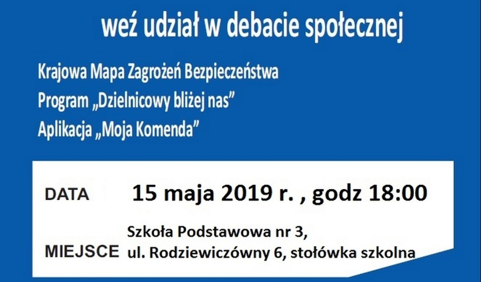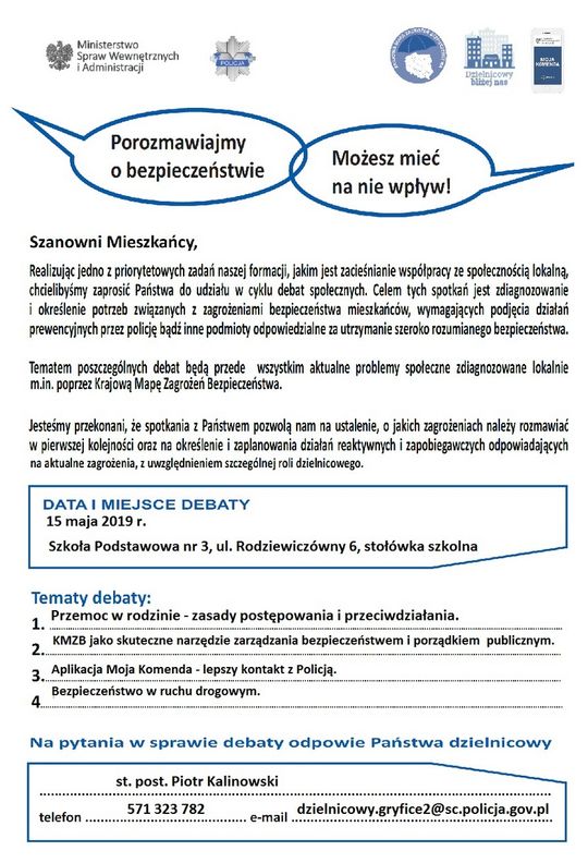 W środę 15 maja br. o godz. 18:00 w budynku Szkoły Podstawowej nr 3 przy ul. Rodziewiczówny 6 w Gryficach odbędzie się debata społeczna, której tematem przewodnim będzie „Bezpieczeństwo i porządek publiczny mieszkańców Osiedla XXX-lecia w Gryficach".