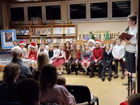 Zgromadzona publiczność miała przyjemność wysłuchać koncertu mikołajkowego w wykonaniu uczniów Szkoły Muzycznej I Stopnia w Goleniowie – filia w Nowogardzie. Dzieci zaprezentowały polskie kolędy oraz świąteczne piosenki, które były zarówno śpiewane, jak i wykonywane na instrumentach. Występ wzbudził ogromne uznanie wśród obecnych, którzy gromkimi brawami nagrodzili młodych artystów. Za koncert dzieci otrzymały słodkie upominki, a opiekunka Pani Karolina Soborska – podziękowanie.